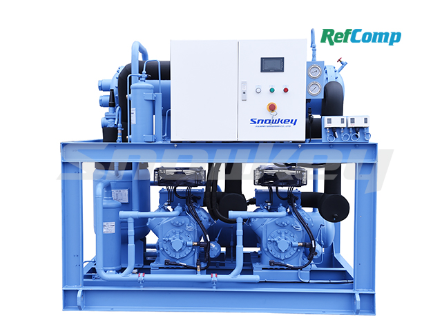 Snowman use RefComp SP compressors for this series of units. The power range is 6- 160HP. Per the request of the customers, the HP of the unit can be as high as 240HP. Units configuration is flexible: units can packaged with water- cooled condenser, air- cooled condenser orwithout condenser. With many years of experience, the units are user- friendly: suction port, drainage port and oil charge port are all included, rendering easy maintenance and replacement. Components of the units: RefComp compressor, oil separator, (condenser), suction accumulator, economizer, liquid receiver, control center, etc..